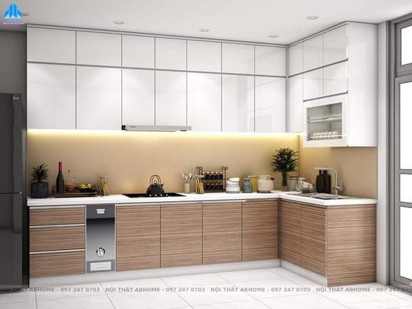 Tủ bếp ABTB11 | ABHOME: Một cảm giác mát mẻ đầy thư thái, xóa đi cái không khí nóng bức ngột ngạt thường thấy ở các khu bếp nhờ sự kết hợp thông minh giữa 2 sắc màu trắng và vân gỗ. Không những vậy, mẫu nội thất nhà bếp sang trọng này còn mang đến cho ta cảm giác bình an và tràn đầy năng lượng.